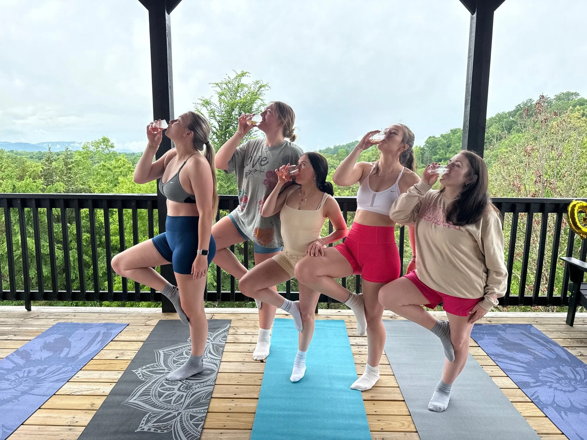 In our signature session, Namaste then Rosè, you will move, stretch, and breathe in a way that feels good for every level in your group! The flow is customized to your vibe, whether you want slow and relaxing or something more energetic and fun. We build a playlist with your groups favorite music because music truly sets the mood and this should feel like YOUR group’s class, not a template.
