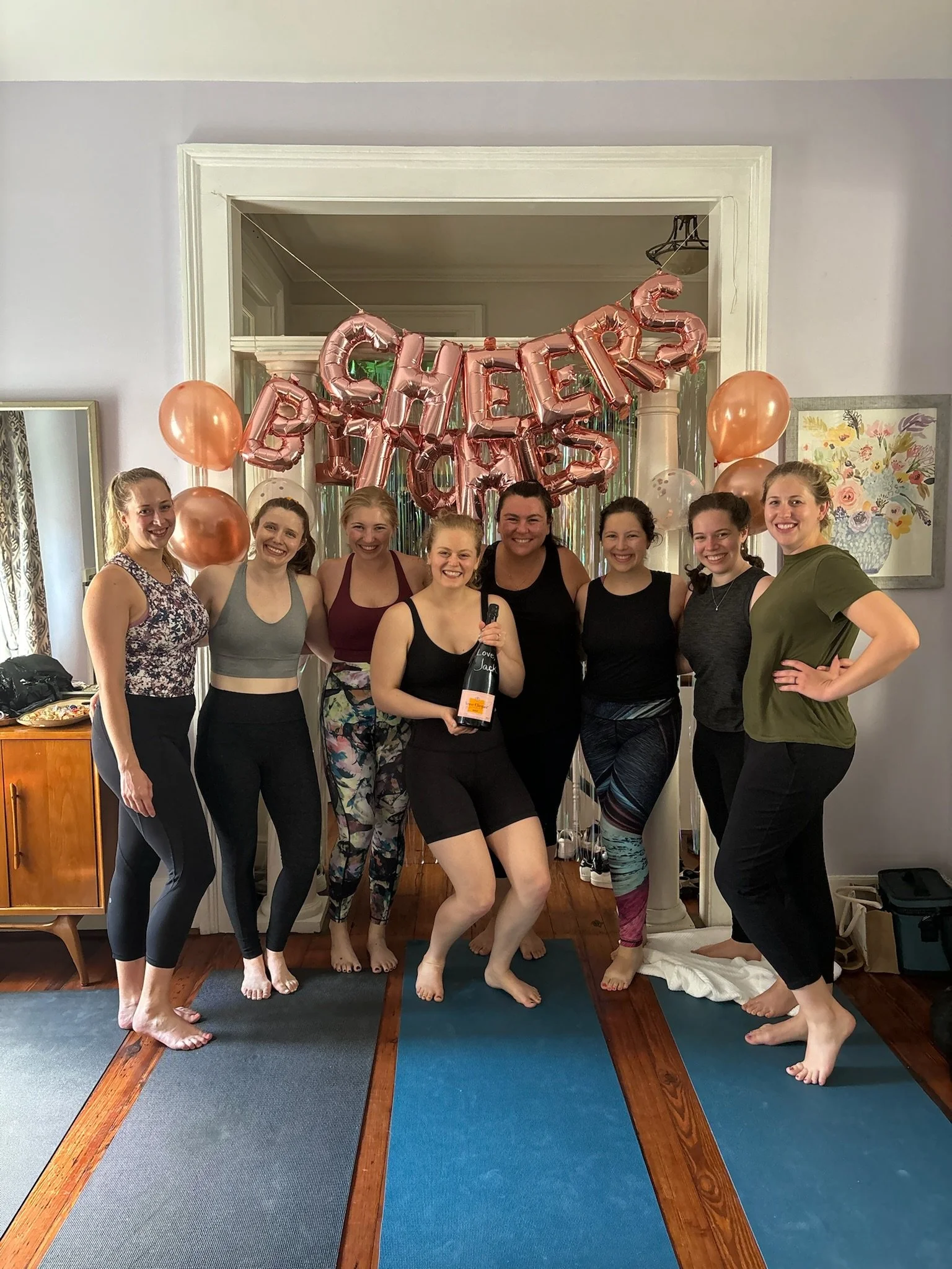 For Nicole, it's all about the unique joy of the experience. Whether she's teaching our signature Namaste then Rosé class or a more personalized session, she says, "We get to create unforgettable memories for brides and their closest friends, blending movement, laughter, and connection in a way that feels fun, nurturing and meaningful."